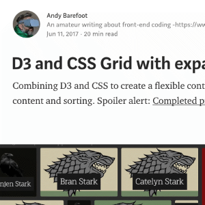 Having started using CSS Grid I was interested in exploring its ability to lay out different size content blocks into a densely packed grid. For this I used all the characters from Game of Thrones that I had gathered for a data vis project.