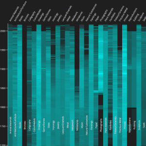 This data visualisation attempts to show the distribution of the entire collection by date and to show the difference in age depending on the type of artefact. For example, the majority of vases in the collection are from around the year 300 A.D or before.