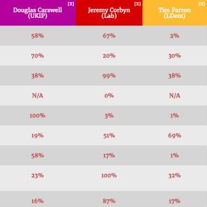 The site the Public Whip aggregates the data on how MPs in the UK parliament vote. They then group this by similar votes to provide an insight into how much each MP supports a particular policy.