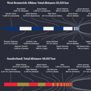 A data visualisation to show the distance travelled by each Premier League footballer to get to their current club. It shows the distance from the player's birthplace and the clubs they have been at along the way both individually and totalled for each club.